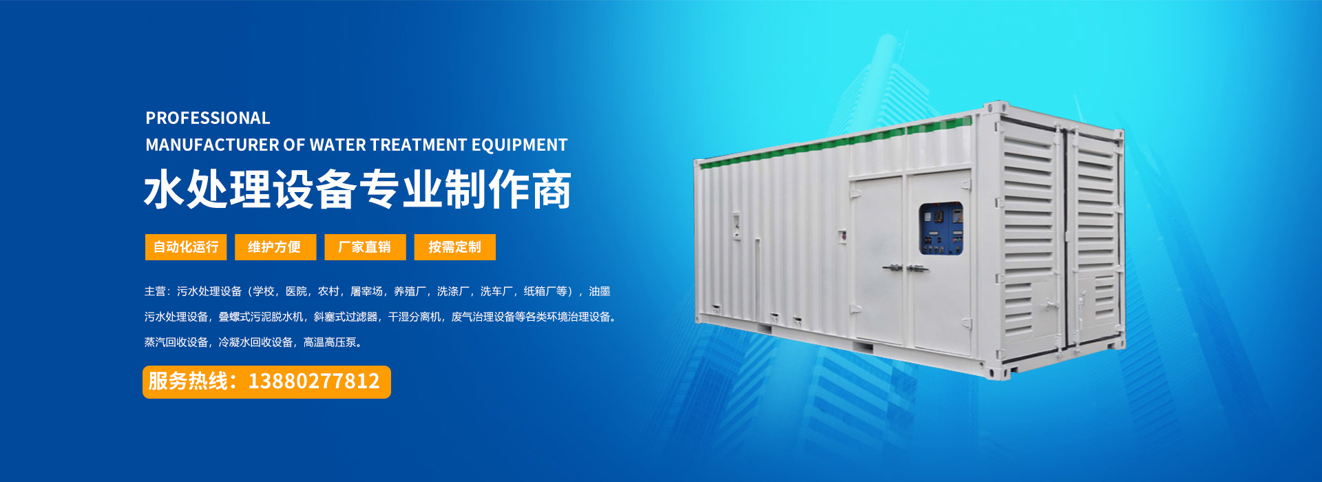 四川宇藍(lán)環(huán)保工程有限公司是水處理設(shè)備及各類環(huán)境治理設(shè)備的生產(chǎn)廠家并承接各類環(huán)境治理設(shè)備的工程項(xiàng)目。 公司專門從事各類環(huán)境治理設(shè)備及冷凝水蒸汽回收設(shè)備的開發(fā)、設(shè)計(jì)、制造、銷售以及技術(shù)服務(wù)的綜合性公司,主要產(chǎn)品有:污水處理設(shè)備(學(xué)校,農(nóng)村,屠宰場(chǎng),養(yǎng)殖場(chǎng),醫(yī)院,小區(qū),紙箱廠,洗滌廠等),油墨污水處理設(shè)備,疊螺式污泥脫水機(jī),斜塞式過(guò)濾器,干濕分離機(jī),廢氣治理設(shè)備等各類環(huán)境治理設(shè)備以及蒸汽回收設(shè)備,冷凝水回收設(shè)備,高溫高壓泵等各類節(jié)能減排的節(jié)能設(shè)備。 ...